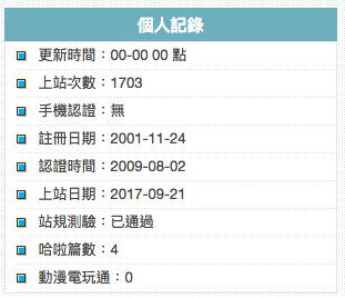- 目前不提供搜索使用者的功能,想要查看其他使用者的資訊,只能先點擊該使用者出現於紀錄或者他處的帳號連結才能進入其帳號資訊頁面。
